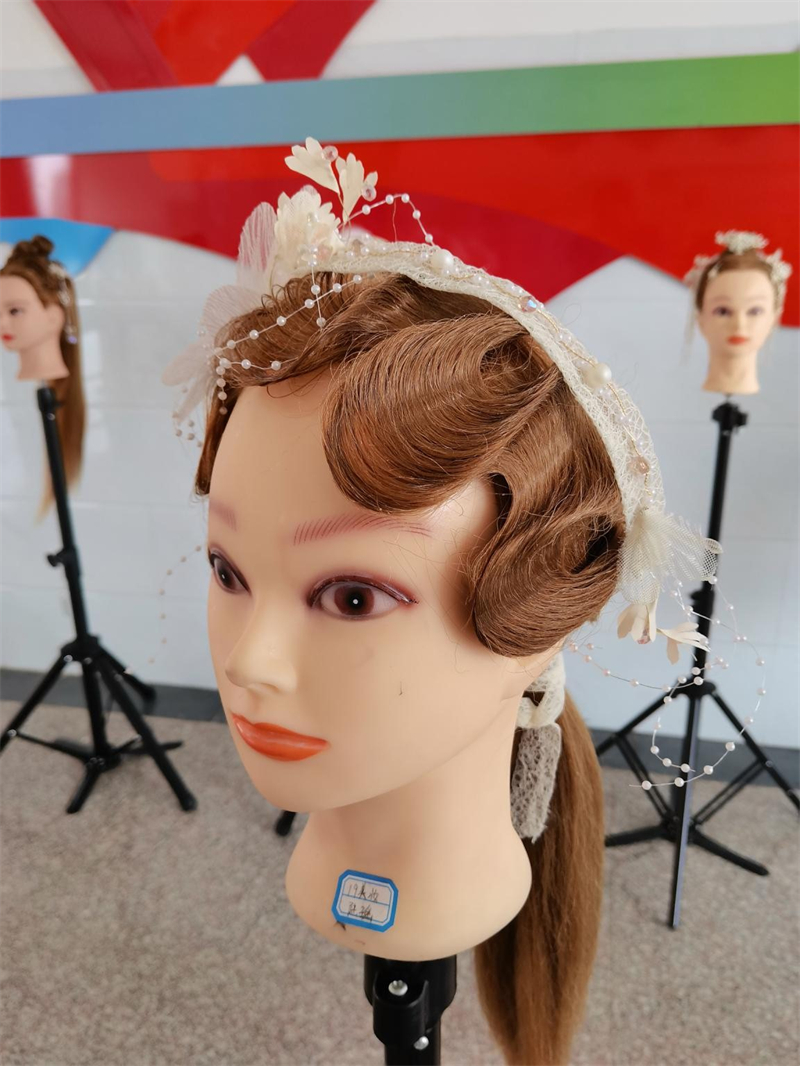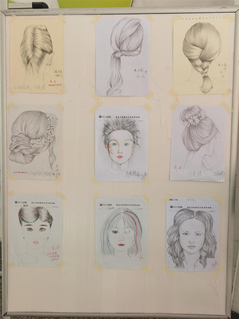 美发与形象设计专业和美容美体专业的学生向大家展示了妆容发型设计图、发型作品、头饰作品以及平面构成和色彩构成作品。平面构成和色彩构成作品具有强烈的视觉冲击力;妆容、发型设计图写实生动;中式新娘盘发、手推波纹、休闲编发等发型作品在精致的饰品点缀下,或高雅,或华丽、或喜庆、或浪漫。不同形式的展示,体现了学生对美的理解,以及对更高技术的追求。