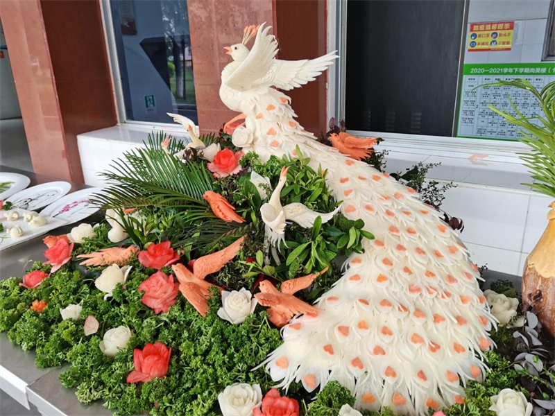 烹饪专业的学生分别展示了雕刻、热菜、面点制作以及画盘技术。其中,雕刻作品《孔雀迎宾》雍容大气,白萝卜摇身一变成为华丽孔雀与娇艳欲滴的花朵,胡萝卜雕刻成的小鸟在“绿草丛”中欢快鸣唱。热菜作品《花开富贵》虽已展示多时,依旧香气扑鼻。裹粉炸制的《菊花鸡脯》黄得似金,均匀的线条展示着学生们精湛的技艺和纯熟的刀功。面点油酥点心《鼠(数)你最棒》制作的栩栩如生,七只小老鼠活似乎就灵活现的在我们眼前活动。