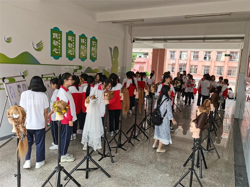 同日,“新娘盘发”项目技能赛校赛在尚美楼一楼开赛。经过激烈的角逐,19级美发与形象设计的蓝珊珊摘得本次桂冠。她的作品作为比赛成果参与职教周的展示。在比赛过程中,一年级学生在现场观摩,她们以这样不同以往的方式进行发型的学习。比赛结束后,专业老师对比赛进行了复盘点评,这使学生们再次对盘发技艺有了更高更深的理解。同时也更能明白“台上一分钟,台下十年功”的成功法则。