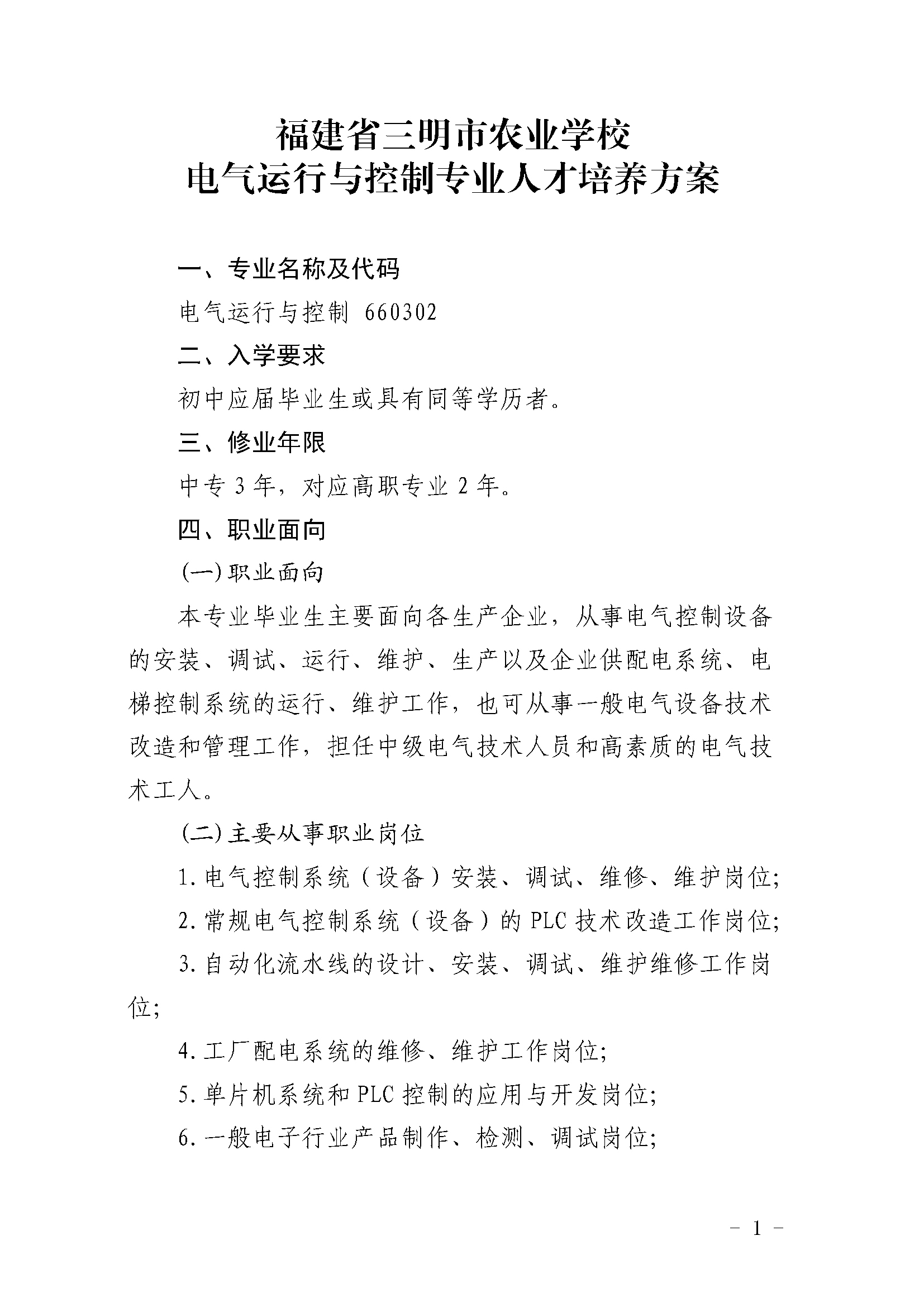 三明市农业学校电气运行与控制专业人才培养方案(2023)