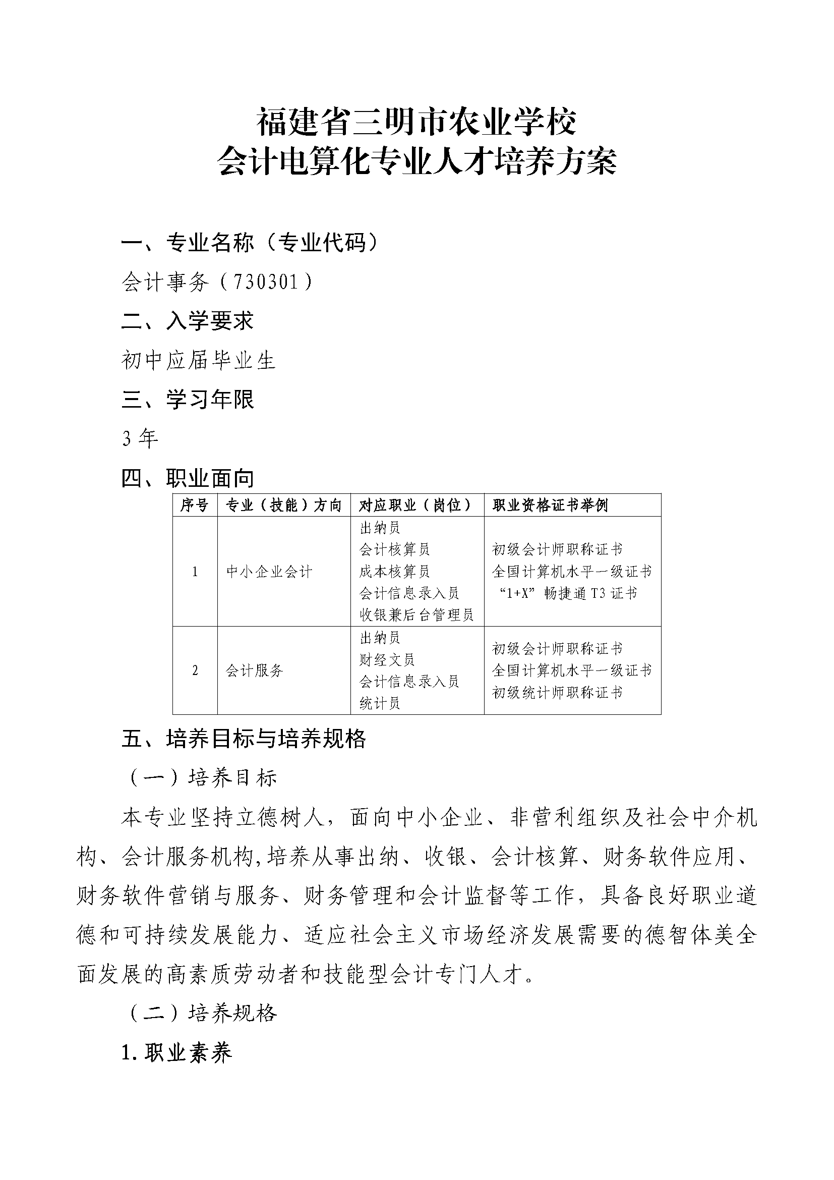 三明市农业学校会计事务专业人才培养方案(2023)
