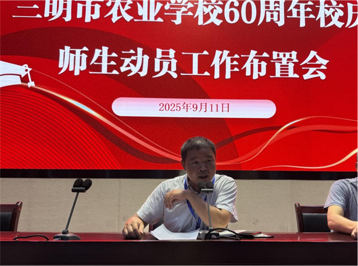 金秋送爽,华章待启。2025年9月11日,在喜迎我校建校60周年华诞倒计时之际,三明市农业学校在校学术报告厅召开建校60周年高质量发展大会师生动员工作布置会,全面部署校庆庆典筹备任务。校党委委员、校长陈文优,党委委员、副校长胡安生出席本次会议,共同吹响攻坚“集结号”。动员大会由校团委书记官炳火主持。