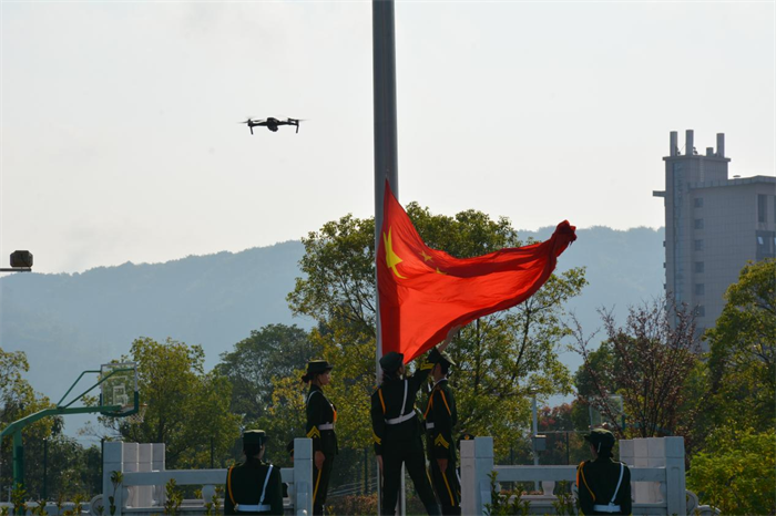 仪式开始,全体人员肃立,面向国旗行注目礼。伴随着激昂的中华人民共和国国歌,五星红旗冉冉升起。今年是纪念中国抗日战争暨世界反法西斯战争胜利80周年,五星红旗作为中华民族不屈精神的象征,见证了国家的发展辉煌。九三阅兵盛典中,人民军队的铿锵步伐、大国重器的威严列阵,深刻诠释了“国家有力量,民族有希望”的时代内涵,为全体新生上了生动的爱国主义教育第一课。